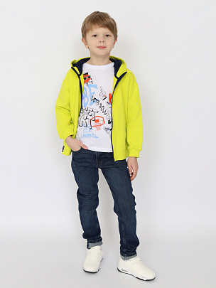 Толстовка с центральной застежкой, длинными рукавами, притачным поясом и манжетами. Манжеты выполнены из полотна с добавлением лайкры, пояс выполнен из основного полотна. Капюшон со шнурком и подкладкой контрастного цвета. Пояс декорирован вязаной нашивкой. Спина декорирована принтом "Скейтерам суждено кататься".
