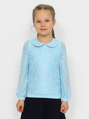 Джемпер для девочки с длинными рукавами и отложным воротником. Рукава из сетки с манжетами из кулирки. Полочка двойная - нижний слой из кулирки, верхний из сетки. Сзади застежка на пуговицу.