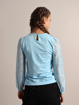Джемпер для девочки с длинными рукавами и отложным воротником. Рукава из сетки с манжетами из кулирки. Полочка двойная - нижний слой из кулирки, верхний из сетки. Сзади застежка на пуговицу.