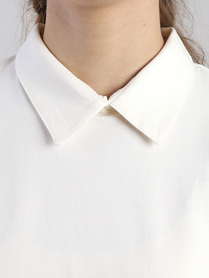 Джемпер для девочки с короткими рукавами, свободного силуэта, спущенным плечом и отложным воротником. Сзади застежка на пуговицу. Спереди декорирован металлическим лейблом.