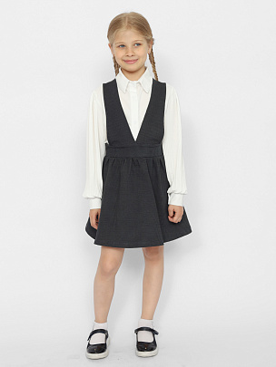 Сарафан для девочки выполнен из набивного футера - имитирует костюмную ткань. Школьный сарафан на широких бретелях без лишних застежек и замков имеет удобный А-силуэт. Добавление в состав эластана обеспечивает идеальную посадку и полную свободу движений. Спереди сарафана расположены прорезные карманы в шве. Сарафан удобно надевать поверх блузки, водолазки, джемпера или футболки, он будет актуален на протяжении всего учебного года.