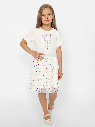 Нарядное платье прилегающего силуэта, с отрезной талией и короткими рукавами. На талии резинка с люрексом. Спереди блестящая шелкография. Верхний слой юбки из сетки с блестящими кружками. Верх платья, нижняя юбка из хлопкового полотна.